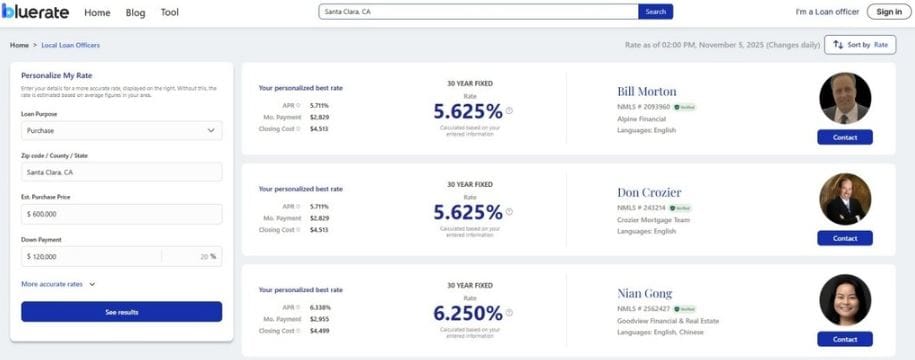 - Direct Connection, No Middlemen: Unlike generic comparison sites that sell your data as a “lead,” Bluerate connects you directly with a local Loan Officer (LO). You aren’t randomly assigned; you can choose an LO based on their specific experience (like VA loans or Non-QM), their company, and their location.