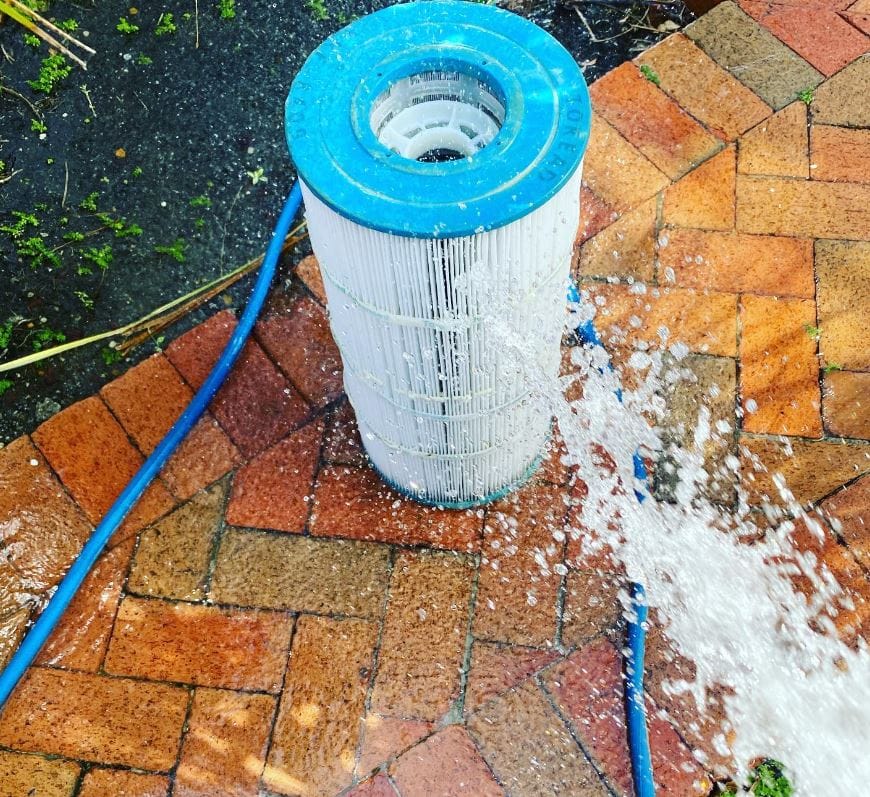 Using a garden hose with a spray nozzle, thoroughly rinse the filter pleats. Start from the top and work your way down, aiming between the pleats to blast out loose debris like leaves, hair, and sand. Pro Tip: Always spray from the inside of the filter outwards, which helps push debris out of the pleats rather than driving it deeper in.